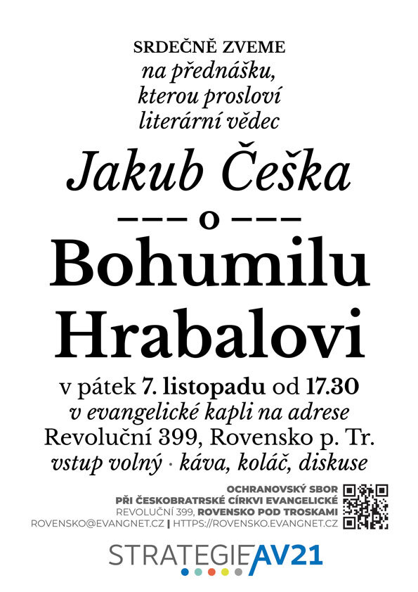 7. listopadu | 17.30 PŘEDNÁŠKA doc. Jakuba Češky o prózách i básních Bohumila Hrabala s občerstvením a diskusí. Děje se ve spolupráci s Ústavem pro českou literaturu AV ČR v rámci výzkumného programu Odolná společnost pro 21. století Strategie AV21. |plakát