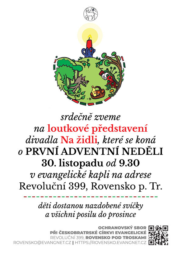 30. listopadu | 9.30 PRVNÍ NEDĚLE ADVENTNÍ s ochranovskými svíčkami a loutkovým představením v podání divadla Na židli. |plakát Odpoledne bude sestra Hana Jalušková hovořit při rozsvěcení městského vánočního stromu na náměstí.
